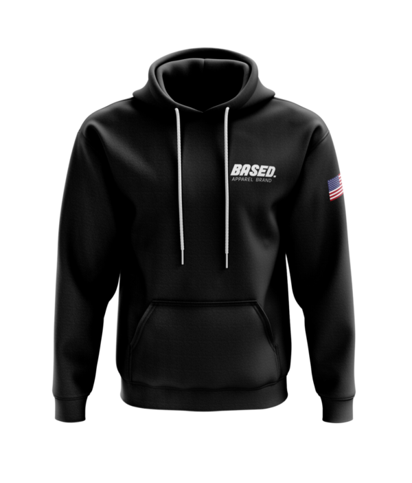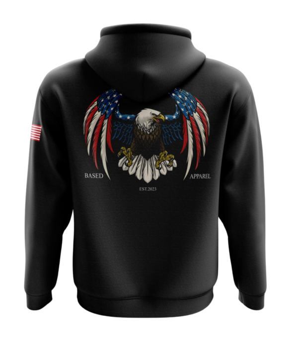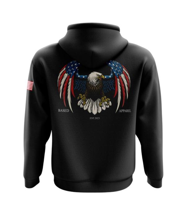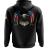 This classic black hoodie features an eagle at the back with the American flag on its wings.