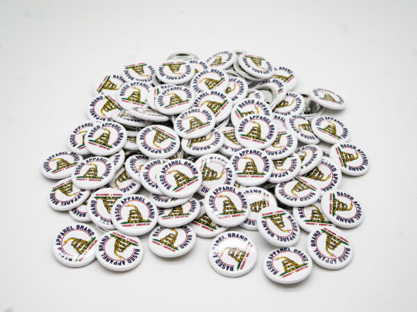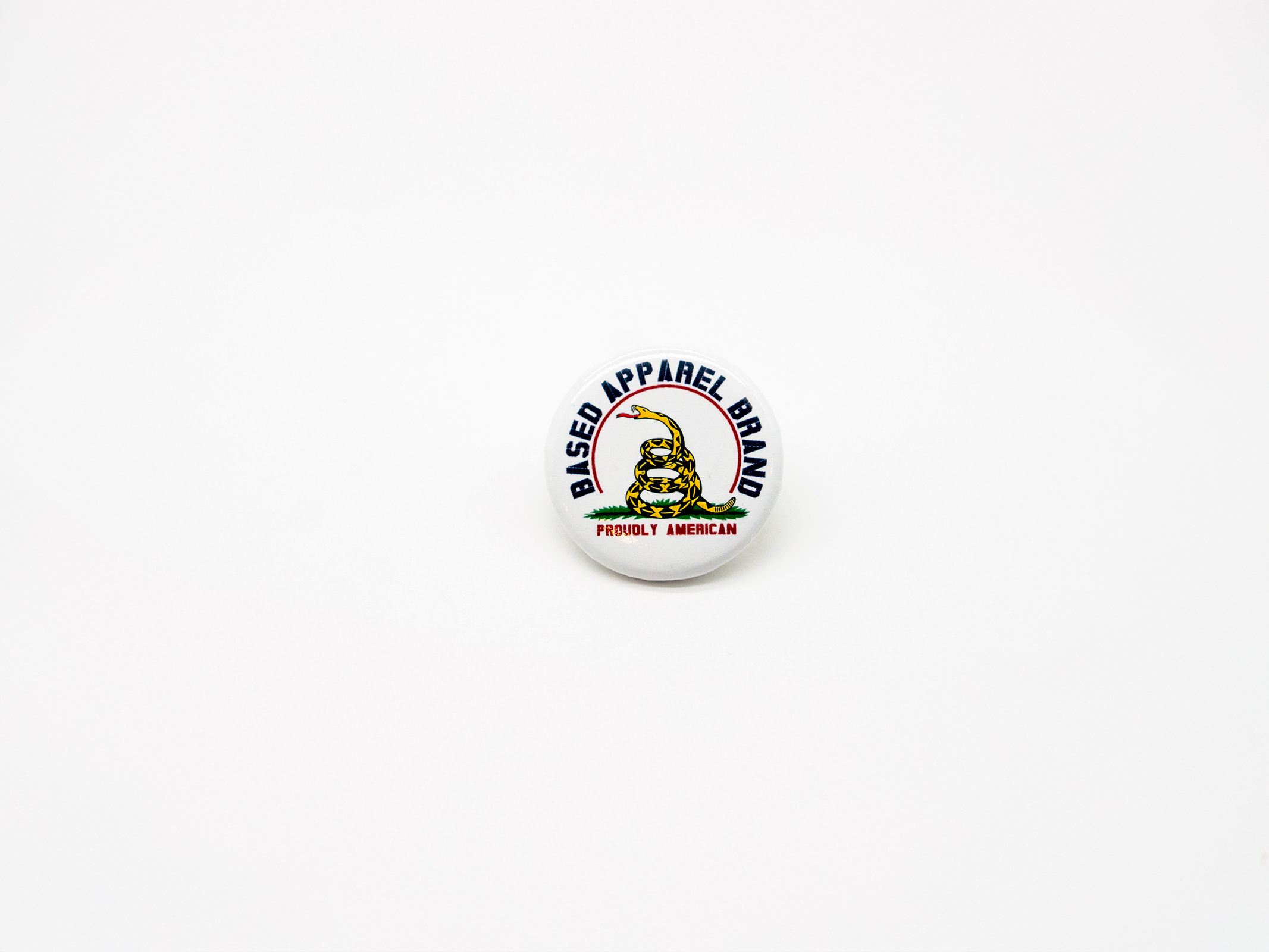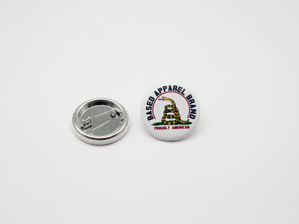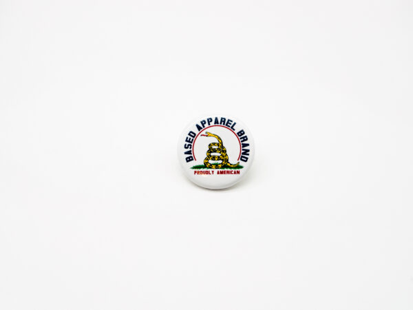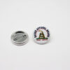 Our Gadsden Flag pin is 1.25″ in diameter and is designed to be worn on hats, a lapel, bags, and more with a durable steel pin-back.