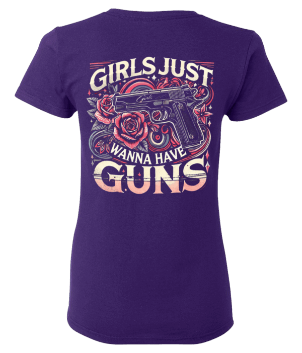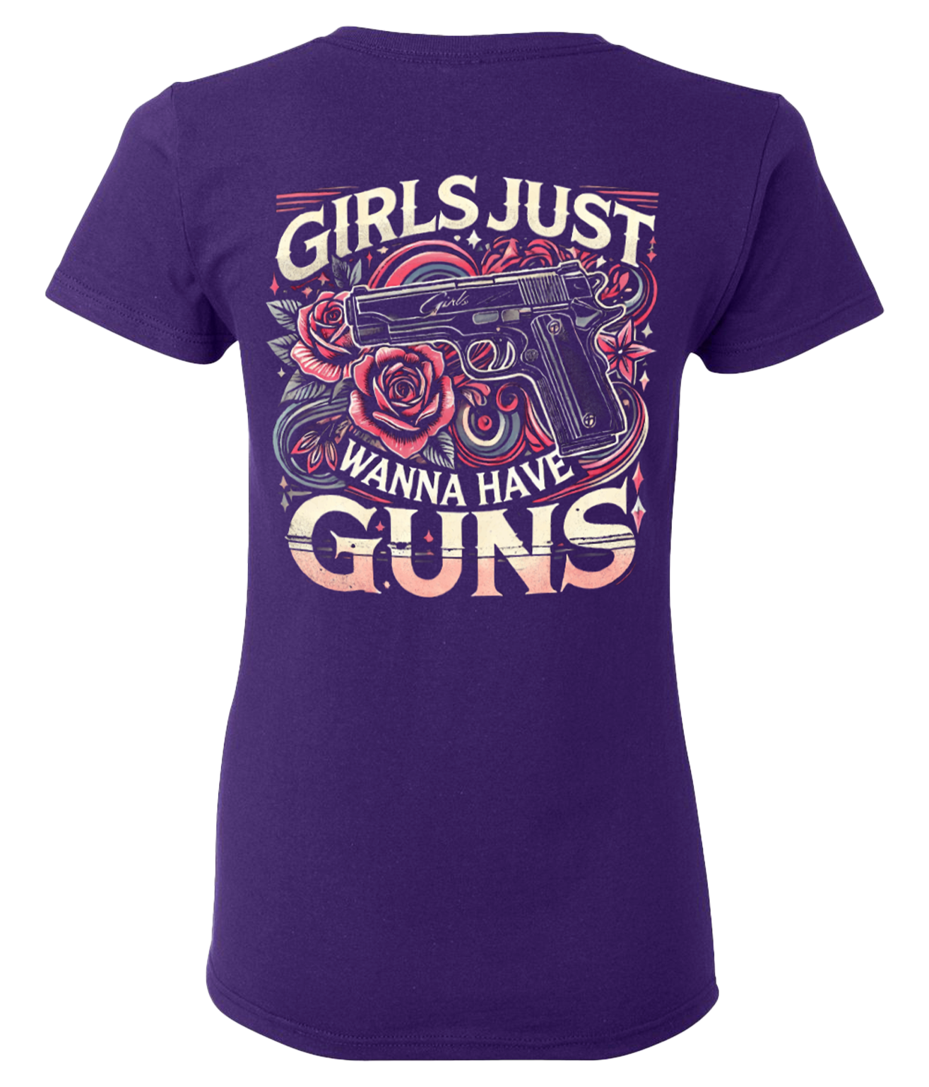 The sequel to our original Girls Just Wanna Have Guns crewneck sweatshirt, this design features an illustrated handgun at the back with roses and our logo at the front.
