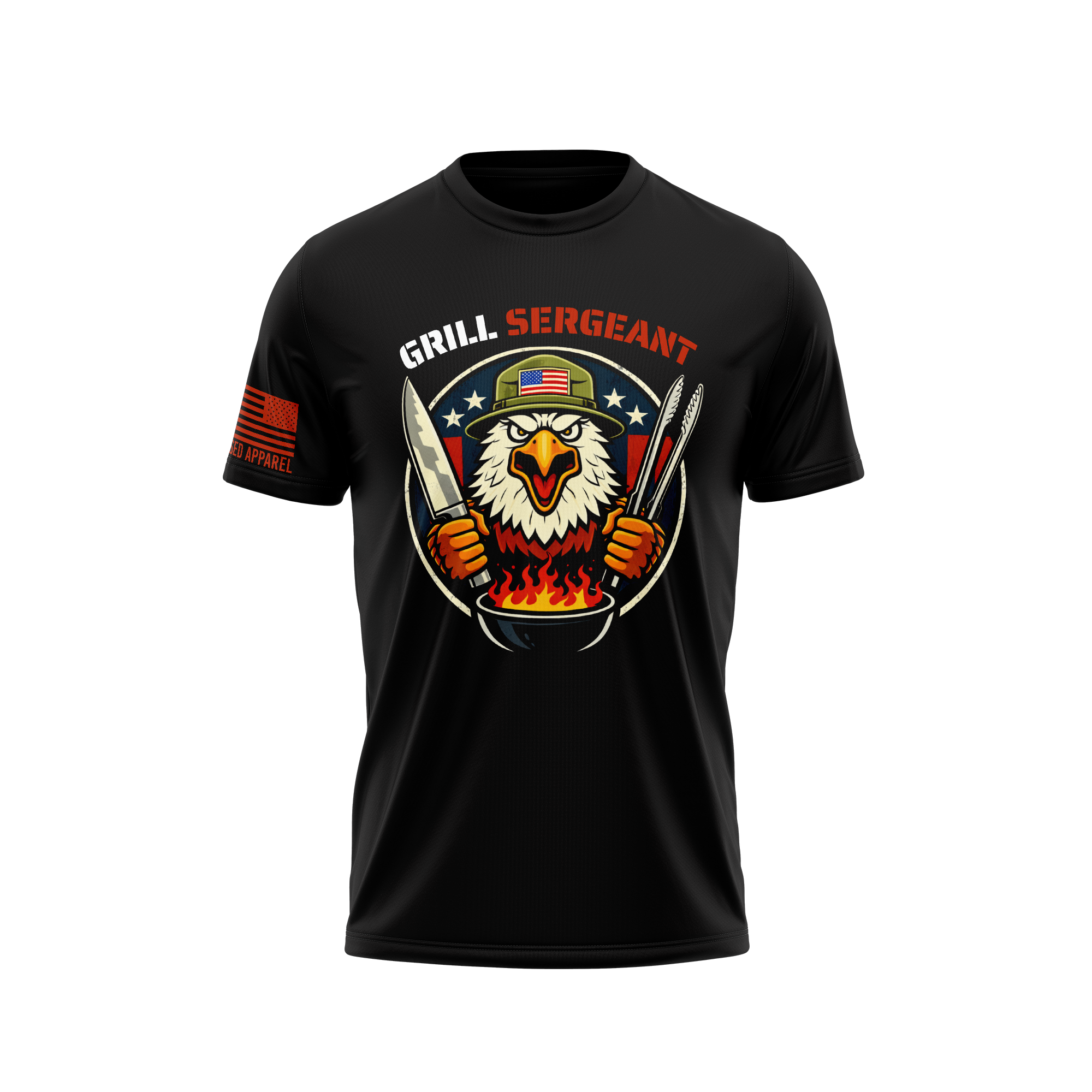 Who runs the backyard? You do. The Grill Sergeant tee is built for the patriot who takes their BBQ as seriously as their freedom. Featuring a bold, fearless bald eagle in full command — military hat, grilling tools, and flames — this navy or black tee is the perfect uniform for every cookout, Fourth of July bash, or weekend smoke session. Made to be worn with pride and a pair of tongs in hand, the Grill Sergeant will have your crew knowing exactly who’s in charge of the grill this summer. Don’t just show up to the cookout — show up in command. 🦅🔥