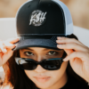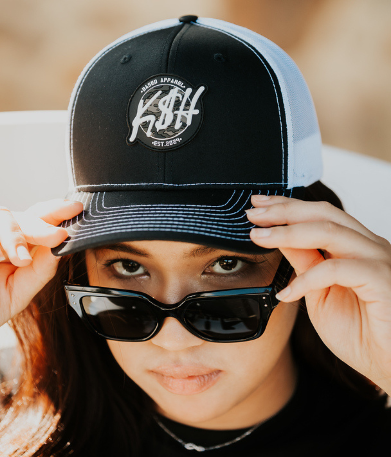 Just in time for summer, this black and white trucker hat is complete with a fresh new K$H logo.