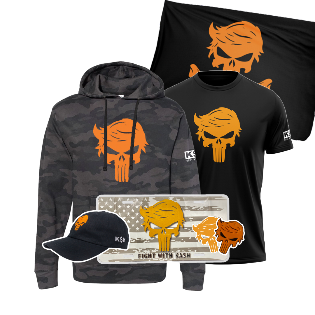 Includes some of our favorite Orange Man Bad products: the camo hoodie, flag, t-shirt, baseball hat, vanity plate, and stickers.