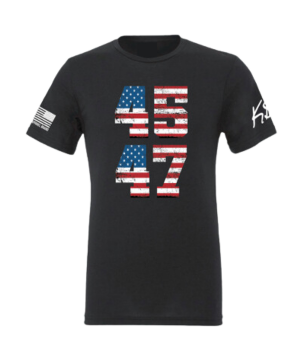 We’re celebrating the greatest comeback in the history of politics: 45 becomes 47. Features Kash Patel’s handwritten signature at one sleeve and an American flag at the other.