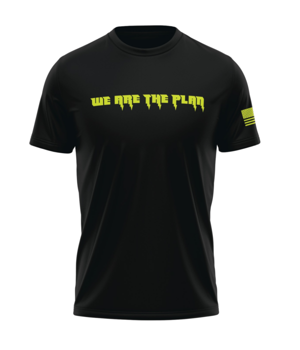 What will you do for your country? The “We Are the Plan” T-Shirt features an electric neon font with lightning bolts and an American flag at the sleeve.