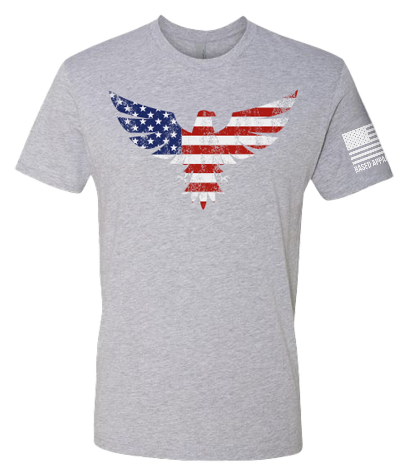 The American eagle, Based style with a distressed effect. Features an all-white American flag at the sleeve.